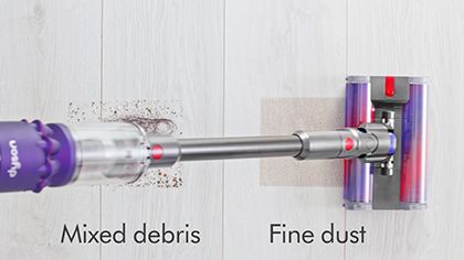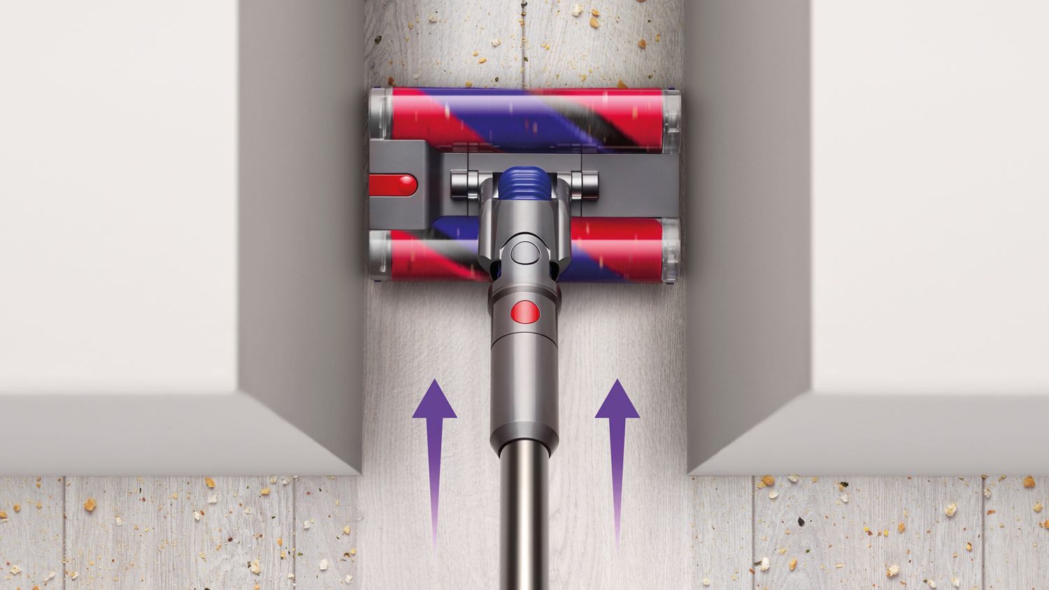 Dysonin keskitetty ja yhdenmukaisesti uudelleenkehitetty teknologia mahdollistaa imurin vaakasuoran asennon* ja ahtaiden tilojen puhdistuksen.⁴
